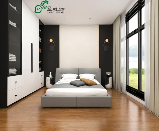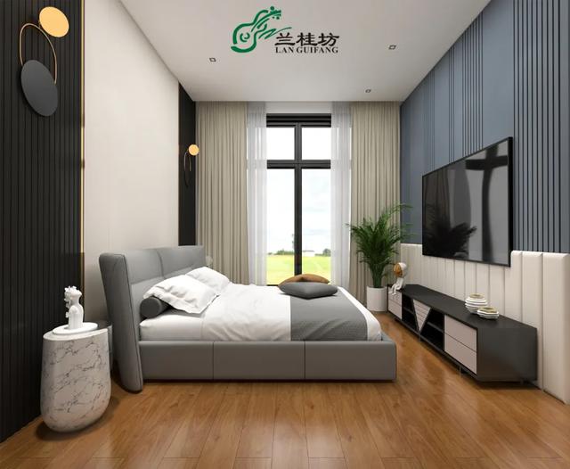 主卧空间在家具的配置上,选择独特简洁的造型与木纹砖G158-749(规格150*800mm)的完美搭配,视觉整体上达到了以少胜多,以简胜繁的效果。黑白灰的家具与电动米咖色的窗帘相互搭配,简洁明快、实用大方。