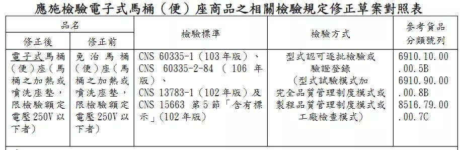 陶卫网讯 台湾新版电子式马桶(便)座商品检验规定已于7月1日正式实施。2019年2月18日,台湾发布新版电子式马桶(便)座商品检验规定。根据规定要求,自2020年7月1日起实施输入及商品检验,检验方式为型式认可逐批检验或验证登录双轨并行。