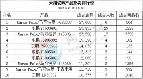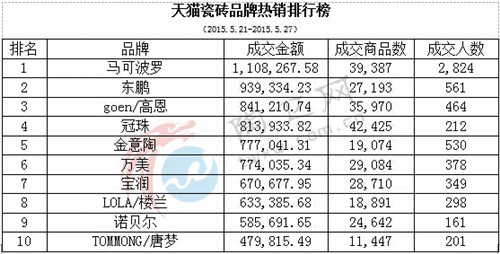 陶卫网讯 (记者 庞杏华)5月21日到5月27日天猫瓷砖品牌热销榜中各品牌的的成交商品数与上周基本持平,成交金额比上周略微下降。排名前十品牌的分别有马可波罗、东鹏、goen/高恩、冠珠、金意陶、万美、宝润、LOLA/楼兰、诺贝尔、TOMMONG/唐梦。