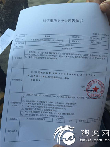 记者与供应商代表一起于11月5号上午十一点多到达自治区信访局,却赶至他们下班时间。只到下午两点半,供应商们才可以进入信访局的大门,信访局的官员在第一时间与几位供应商代表进行会谈。面对廖伟良人间蒸发、被合作伙伴追债,企业面临倒闭,求助无门的情况,代表们表示他们非常无奈、伤心和失望。但信访局的答复却是令人无法信服的,“这些事情不该由信访局处理”。信访局拟给代表们一份 “信访局不予受理”的文件,请供应商方面签收,供应商们拒绝签收该文件。此外信访局还建议供应商再次请求藤县政府协助,或者自行约出新中陶老板,近三个月的努力供应商们因不满上级部门协调结果,一直在坚持向上诉求,今天却又回到了原点,回到了他们不愿提及的新中陶。